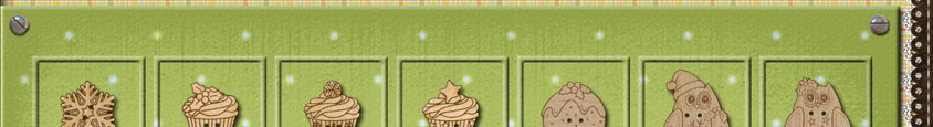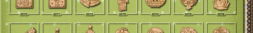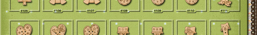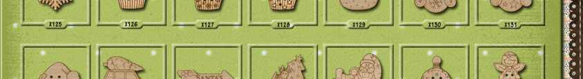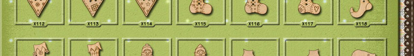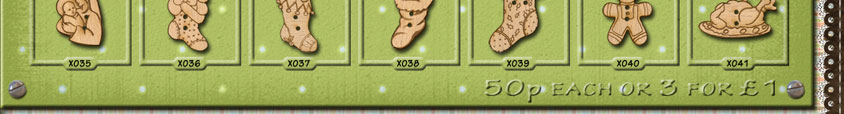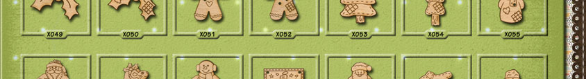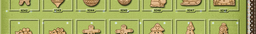 X049 Holly 31mm x 20mmX050 Holly 31mm x 20mmX051 Gingerbread Man 26mm x 27mmX052 Gingerbread Man 26mm x 27mmX053 Christmas Tree 24mm x 31mmX054 Christmas Tree 16mm x 43mmX055 Snowman 17mm x 31mm