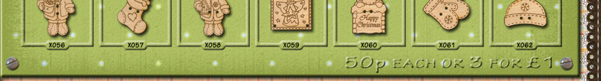 X063 Snowman Square 25mm x 25mmX064 Rudolf Square 25mm x 25mmX065 Let It Snow 25mm x 25mmX066 Santa Square 25mm x 25mmX067 Moose 27mm x 30mmX068 Moose and Trees 27mm x 31mmX069 Angel with Present 25mm x 25mm