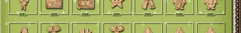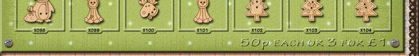 X098 Penguin 27mm x 30mmX099 Moose 23mm x 33mmX100 Reindeer Head 19mm x 26mmX101 Moose 23mm x 33mmX102 Bauble Tree 20mm x 29mmX103 Stars Tree 20mm x 29mmX104 Swirley Tree 20mm x 29mm