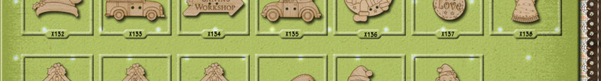 X132 Santa Hat 32mm x 24mm X133 Christmas Tree Car 37mm x 27mm X134 Santa's Workshop Sign 42mm x 18mm X135 Rudolf's Got His Tree 39mm x 30mm X136 Santa Moon 31mm x 30mm X137 Love Bauble 20mm x 27mm X138 Angel 20mm x 32mm